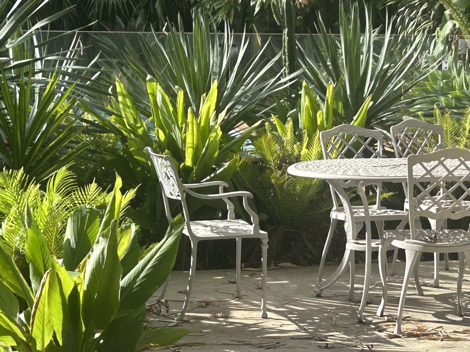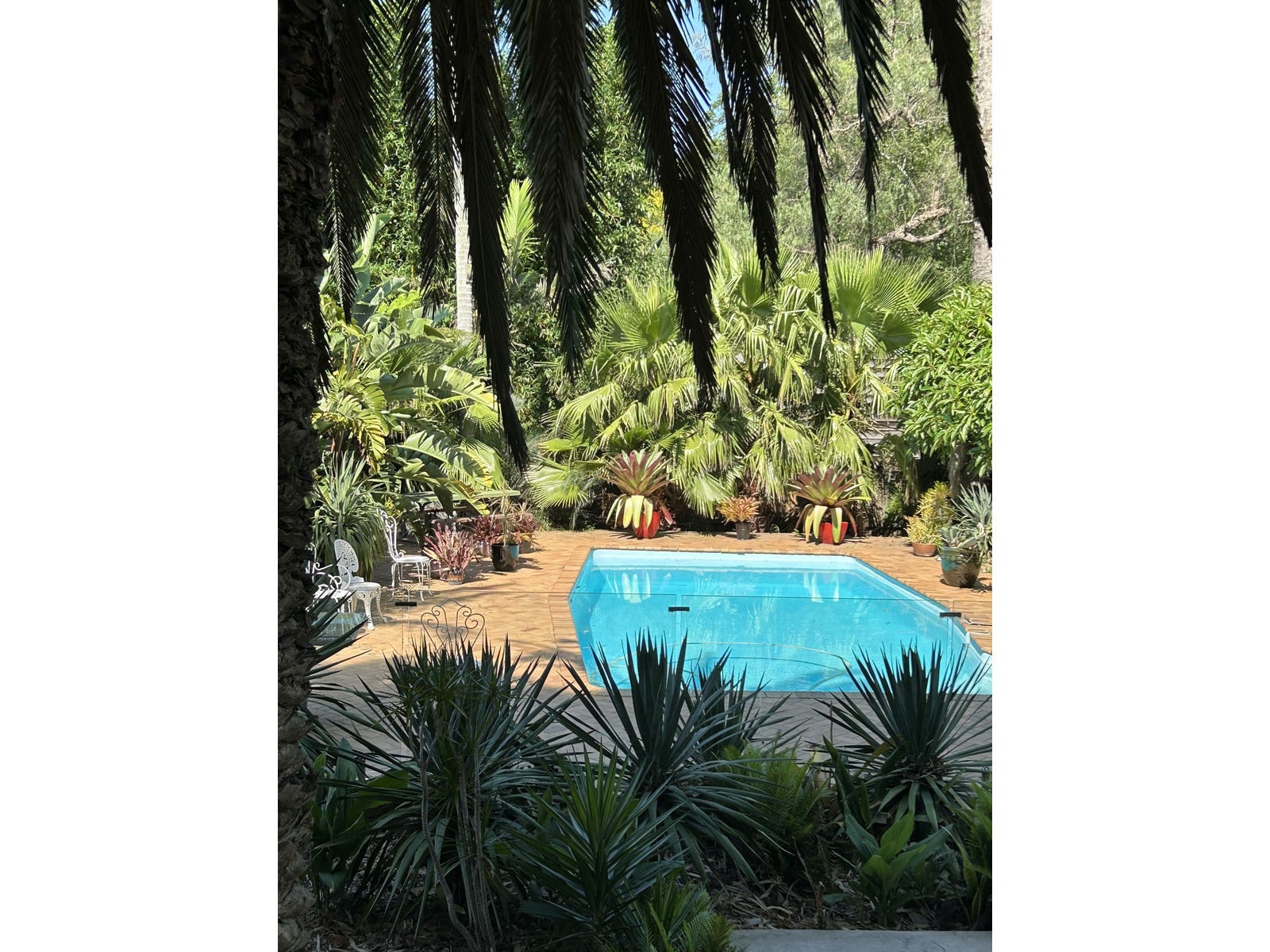 The in ground pool is located in a sunny warm part of the garden enclosed in a tropical garden. An outsid shower is adjacent with hot water.